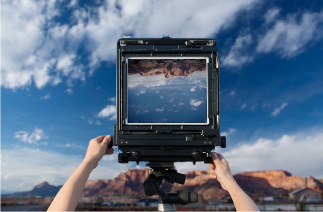 カメラの原点である大判カメラでの撮影実習を通して写真の原理を理解し、カメラ基礎で学んだ知識をより一層深めます。また、写真の「写りの美しさ」を目を通して体感します。