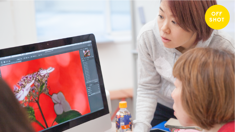 風が吹く音や花の香りなど、撮影者は視覚以外の感覚も研ぎ澄ませて五感で写真を撮ります。けれど出来上がりは視覚のみで捉えた現実(モノ)しか写り込みません。生じるギャップを補正して、あなたが抱いたイメージを再構築するのがレタッチ(画像調整・加工)です。レタッチコースでは、Photoshop操作を学んで効果を理解しながら、一歩進んだレタッチ術を学びます。「レタッチ<中級>コース」では自身が撮影した写真を使って、撮影時に視覚以外で捉えたことを呼び起こしながら、イメージを具現化していくための術を習得していきます。また、「レタッチ<作品制作>コース」では、初級中級で得た技術を生かし、“作品”に必要な知識を学びながら制作していきます。